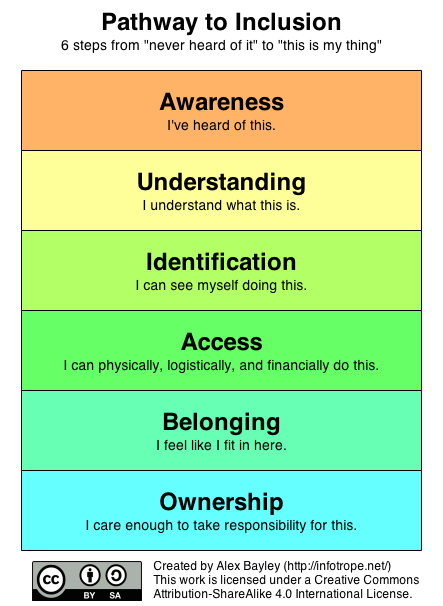 Lately I’ve been working on how to make groups, events, and projects more inclusive. This goes beyond diversity — having a demographic mix of participants — and gets to the heart of how and why people get involved, or don’t get involved, with things.