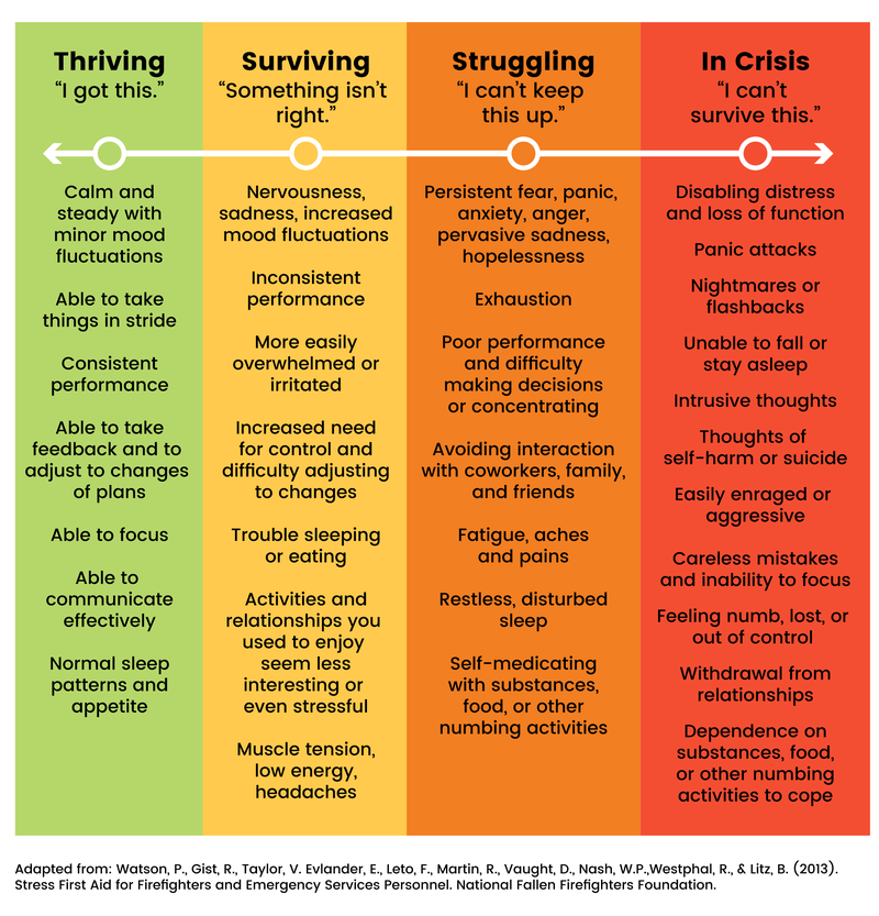 ![Thriving: “I got this.” [green] Calm and steady with minor mood fluctuations; Able to take things in stride; Consistent performance; Able to take feedback and to adjust to changes of plans; Able to focus; Able to communicate effectively; Normal sleep patterns and appetite. -- Surviving: “Something isn’t right.” [yellow] Nervousness, sadness, increased mood fluctuations; Inconsistent performance; More easily overwhelmed or irritated; Increased need for control and difficulty adjusting to changes; Trouble sleeping or eating; Activities and relationships you used to enjoy seem less interesting or even stressful; Muscle tension, low energy, headaches. -- Struggling: “I can’t keep this up.” [orange] Persistent fear, panic, anxiety, anger, pervasive sadness, hopelessness; Exhaustion; Poor performance and difficulty making decisions or concentrating; Avoiding interaction with coworkers, family, and friends; Fatigue, aches and pains; Restless, disturbed sleep; Self-medicating with substances, food, or other numbing activities. -- In Crisis: “I can’t survive this.” [red] Disabling distress and loss of function; Panic attacks; Nightmares or flashbacks; Unable to fall or stay asleep; Intrusive thoughts; Thoughts of self-harm or suicide; Easily enraged or aggressive; Careless mistakes and inability to focus; Feeling numb, lost, or out of control; Withdrawal from relationships; Dependence on substances, food, or other numbing activities to cope. -- Adapted from: Watson, P., Gist, R., Taylor, V. Evlander, E., Leto, F., Martin, R., Vaught, D., Nash, W.P.,Westphal, R., & Litz, B. (2013). Stress First Aid for Firefighters and Emergency Services Personnel. National Fallen Firefighters Foundation.](/media/images/StressContinuum.width-800.png)