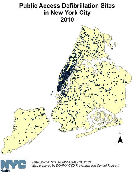 Public Access Defibrillation Sites in New York City 2010. Data source: NYC REMSCO May 31, 2010; map prepared by DOHMH CVD Prevention and Control Program. A map of dots showing the neighborhoods in New York City that have PAD sites.