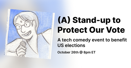 (A) Stand-up to Protect Our Vote: October 26th at 8pm ET. A tech comedy event to benefit US elections. (watercolor image of Sumana holding a mic)