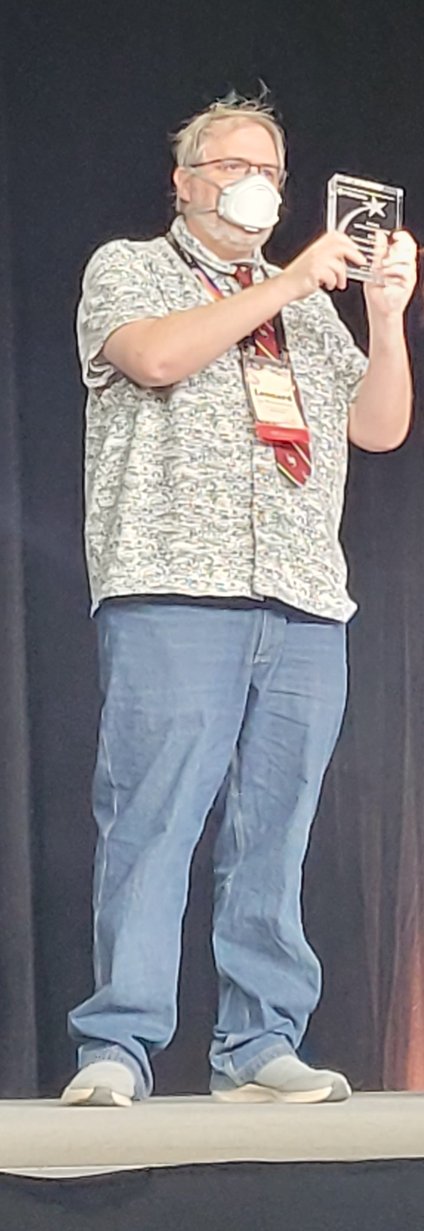 I scurried from my seat to take approximately eighteen not-very-good photos as Leonard rose and walked to the stage, heard PSF's Executive Director Deb Nicholson read his praises, received the physical award, shook hands with her and other winners, and withstood cheers and applause.
