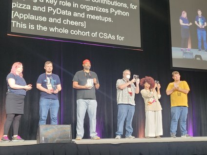 PSF head Deb Nicholson next to a row of award-holding people on a stage, below a caption screen reading "...contributions, for ... a key role in organizes Python pizza and PyData and meetups. [Applause and cheers] This is the whole cohort of CSAs for"